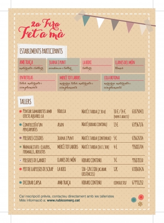 El dissabte 8 d'octubre de 2016 a la Rambla del Ferrocarril tindrà lloc al 2a edició de la Fira fet a mà. Estarà oberta durant tot el dia, de 10 a 20.30 h i tant podreu comprar material (llanes, complements,...) com realitzar tallers insitu. Us hi esperem!!