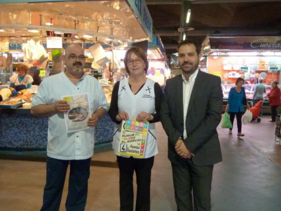 Llorenç Pujol i Dolors Tubau, de la Junta d'Adjudicataris del Mercat Municipal, i Jaume Buscallà, regidor de Comerç, durant la presentació de l'activitat.