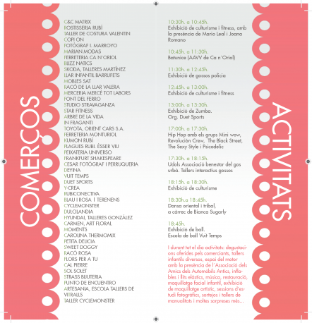 Durant tot el dia hi haurà degustacions oferides pels comerciants, tallers infantils diversos, inflables i llits elàstics, exhibicions diverses, un espai dedicat al motor, etc.