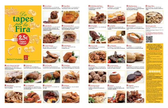 Des d'aquest dijous 8 fins al dissabte 17 d'octubre podreu gaudir de les tapes que els nostres restauradors han elaborat dins de la ruta gastronòmica "De Tapes per la Fira" que és una activitat que s'inclous dins del programa d'activitats de la 21a Fira de Sant Galderic.