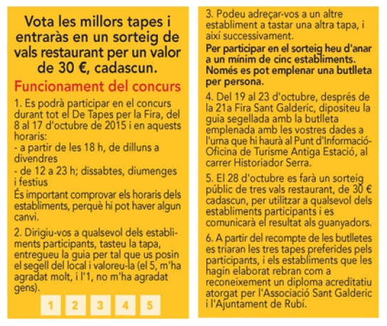 Com a novetat destaquem que en aquesta nova edició es fa el sorteig de vals restaurant per un valor de 30 €, cadascun i també que es reconeixerà als tres establiments que el públic hagi triat com a les tapes preferides.