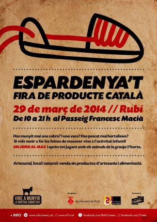 El proper dissabte 29 de març tindrà lloc a Rubí la fira de producte català Espardenya't. Destaquem que trobareu durant tot el dia una exposició de productors d'arrel tradicional i artesans, al passeig Francesc Macià (illa de vianants) i un espai lúdic "Un Jorn al Mas" dedicat als més menuts de la casa on podran aprendre sobre l'horta i els animals de granja, a la plaça Catalunya.