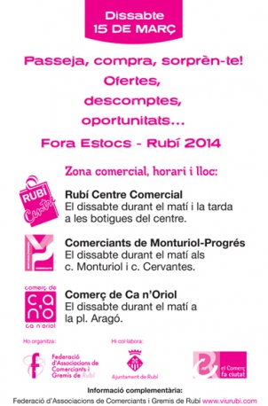 El proper dissabte 15 de març Rubí acollirà la 1a edició de la fira "Fora Estocs" 2014, que és organitzada per la Federació d'associacions de comerciants i gremis de Rubí.