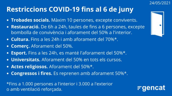 Compartim les noves mesures vigents fins al proper diumenge 6 de juny. Les darreres novetats sobre l'àmbit comercial les trobareu aquí i del àmbit de l'hostaleria i restauració aquí.