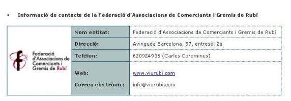 Si desitgeu posar-vos en contacte amb la Federació de comerciants us passem les dades perquè pugueu contactar-hi. És la següent: Nom entitat: Federació d'Associacions de Comer (…) llegir