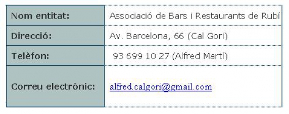 Us mostrem informació més detallada d'aquesta associació. Provisionalment la persona de contacte serà Alfred Martí. Associació de Bars i Restaurants de Rubí Av. Barcelona, 66 (Cal Gori) &nb (…) llegir