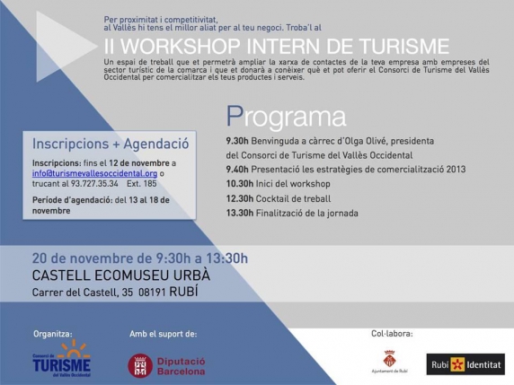 Des de la regidoria de Comerç fem difusió d'aquest proper Workshop intern de turisme que tindrà lloc a Rubí el proper dia 20 de novembre al Castell de Rubí. Si esteu interessats a participar-hi, poseu (…) llegir